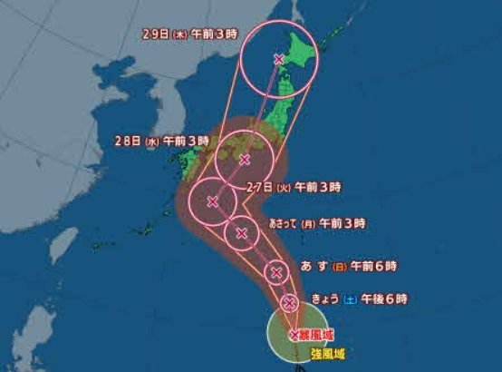 27日(火)には日本の南で非常に強い勢力になる見込みで、最大瞬間風速は60メートルに達すると予想されています。