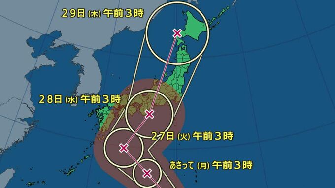 予報円を進むと、27日から28日にかけていったん九州の南東の海上に進んだ後進路を北東よりに変え、四国、近畿、東海を中心に日本列島に接近または上陸するおそれがあります。
