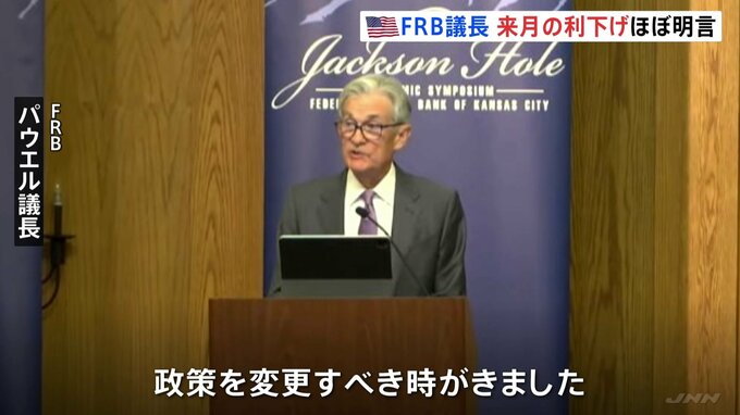 アメリカの中央銀行にあたるFRB=連邦準備制度理事会のパウエル議長が、「金融政策を変更すべき時がきた」と発言し、来月の利下げをほぼ明言しました。FRB パウエル議長「政策を変更すべき時がきました」FRBのパ…