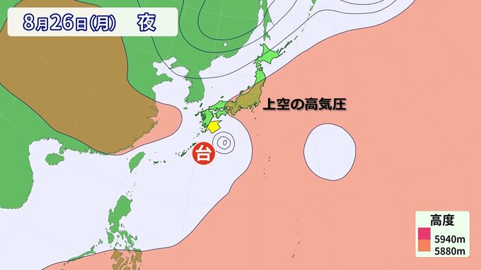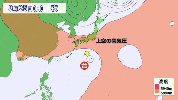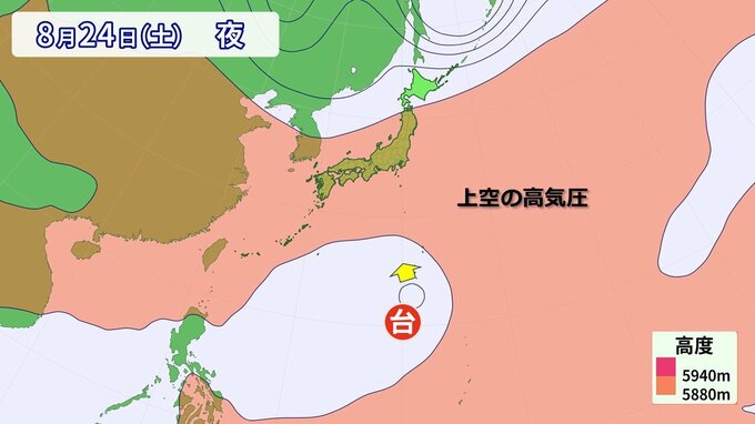 ただ、上空の太平洋高気圧は週明けにかけて勢力がやや弱まる予想で、西日本付近に切れ間ができてくる見込みです。台風はその高気圧の西の縁の沿うように北西方向へと進むとみられます。