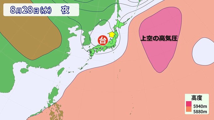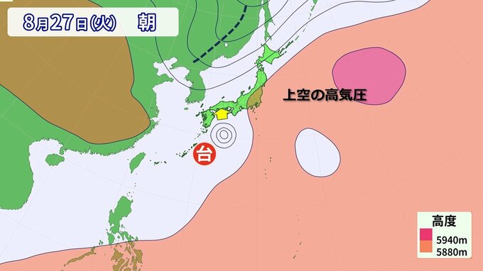 さらに27日以降は西日本へ張り出していた高気圧が東へとやや後退します。また西からは上空の気圧の谷がやや北に偏った形ですが近づくため、北東から北へと向きを変えてやや速度をあげつつ日本列島を縦断する予想です。