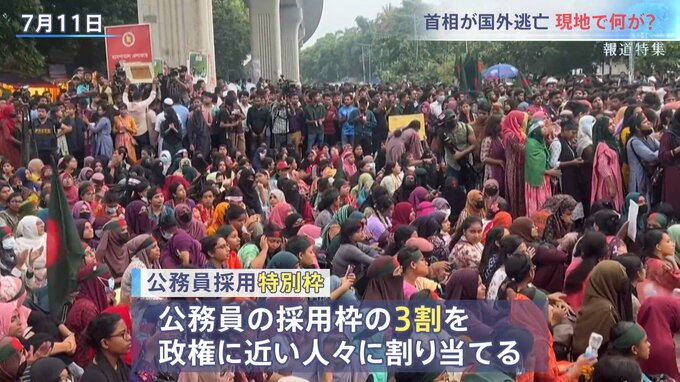 一方で、大卒者は就職難で若者たちの不満が政権トップのシェイク・ハシナ首相に向かった。デモのきっかけは公務員の採用枠をめぐり、政権に近い人々を優遇する制度への抗議だった。