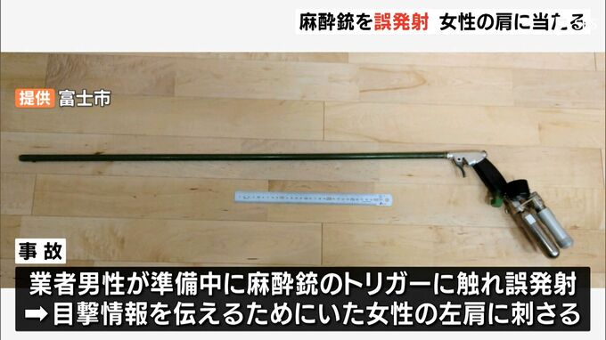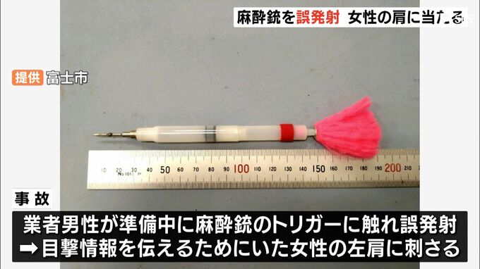 通報を受け、富士市役所の職員3人と市から委託を受けている業者が現場に向かい、サルを発見。捕獲のため、麻酔銃の準備をしていたところ、業者の男性が誤ってトリガーに触れて麻酔の矢を発射し、サルの目撃情報を伝えるため近くにいた女性の左肩に刺さったということです。