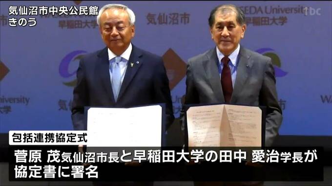気仙沼市で25日開かれた協定の締結式では、菅原茂気仙沼市長と早稲田大学の田中愛治総長が協定書に署名をしました。