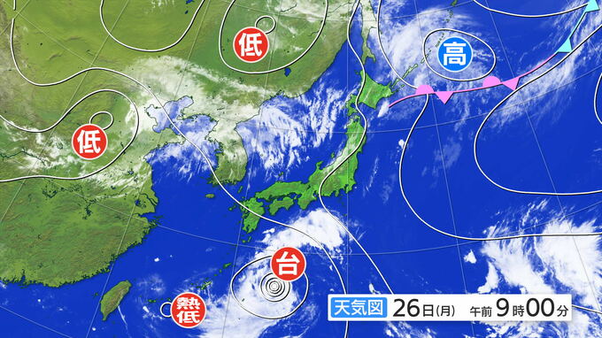 強い台風10号は、午前9時現在、日本の南にあって、時速20キロで西北西に進んでいます。中心付近の最大風速は35メートル、最大瞬間風速は50メートルで、中心から55キロ以内では風速25メートル以上の暴風域となっています。この後も西北西に進み、26日夜にも南西諸島に接近するおそれがあります。
