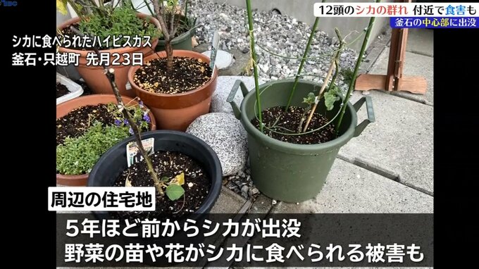 周辺の住宅地では5年ほど前からシカが出没するようになり、プランターの野菜や花が食べられる被害が起きています。