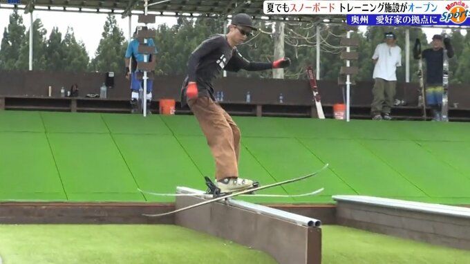 夏でもスノーボードやスキーの練習ができる施設が25日奥州市に完成し、オープン初日から多くの愛好家が集まり楽しみながら練習していました。