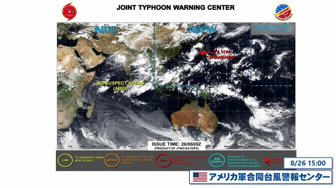 アメリカ・ハワイにあるアメリカ軍の合同台風警報センター(JTWC)の情報です。ここでは監視すべき対象となりうる熱帯低気圧についての情報や台風となった場合の警戒情報などが表示されます。