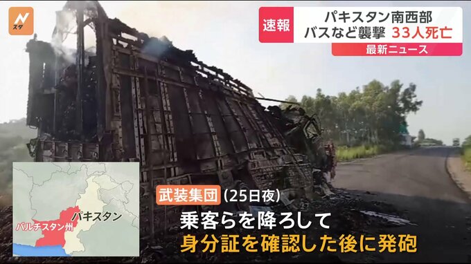 パキスタン南西部で、武装集団による襲撃事件があいつぎ、あわせて33人が死亡したと報じられています。現地メディアによりますと、パキスタン南西部バルチスタン州で25日夜、武装集団が幹線道路で複数台のバスなど…