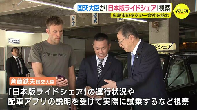 広島市のタクシー会社を訪れた斉藤大臣は、「日本版ライドシェアの」運行状況や配車アプリについて説明を受けたあと、実際に車に試乗するなどしました。