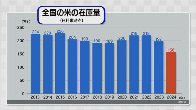 農林水産省によりますと、ことし6月末までの全国のコメの在庫量は156万トンで統計のある25年間で最も少なくなっています。