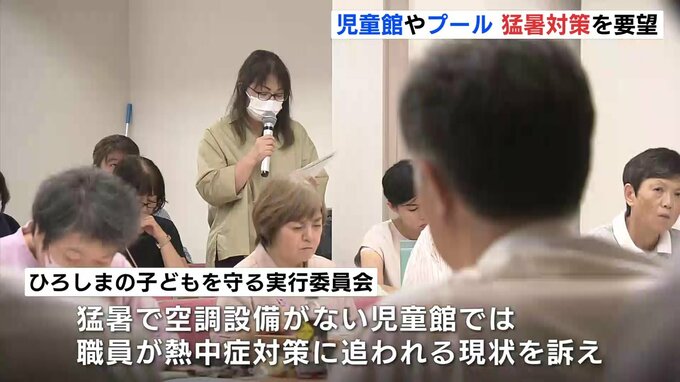 要望書を提出したのは広島市の教育や保育に関わる職員や保護者などでつくる「ひろしまの子どもを守る実行委員会」です。話し合いには児童館や保育所の職員などおよそ60人が出席しました。連日続く猛暑で、空調設備がない児童館では、職員が熱中症対策に追われる現状を訴えました。