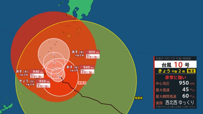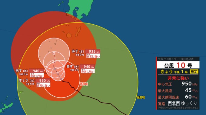 非常に強い台風第10号は、27日9時には奄美市の東約130キロにあって、ゆっくりした速さで西北西へ進んでいます。中心の気圧は950ヘクトパスカル、中心付近の最大風速は45メートル、最大瞬間風速は60メートルで、中心から半径95キロ以内では風速25メートル以上の暴風となっています。
