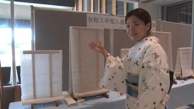 八重山上布の育成者講習の受講生が仕上げた作品も展示され、この日は受講生2人が八重山上布の着物を着て登場、案内役となり会場に華を添えていました。