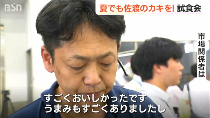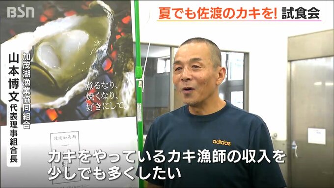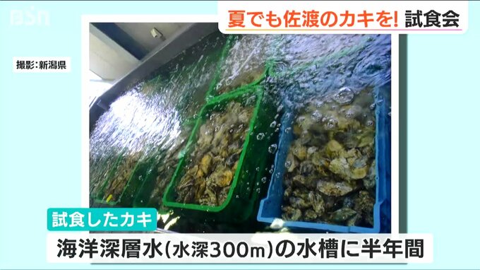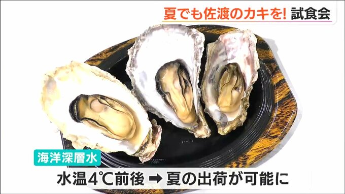 新潟県 佐渡市で養殖される冬の味覚、カキを夏でも出荷しようと、海洋深層水を使って試験的に育てる試みが行われています。27日、そのカキの試食会が開かれました。