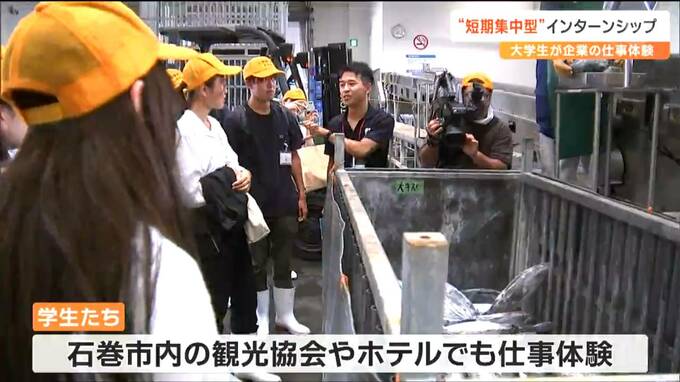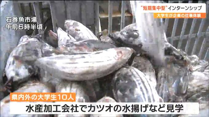 宮城県内の企業に就職するきっかけにしてもらおうという取り組みです。短い期間に複数の企業で仕事を体験する初めてのインターンシップが石巻魚市場などで行われ、大学生が水産業の現場に触れました。