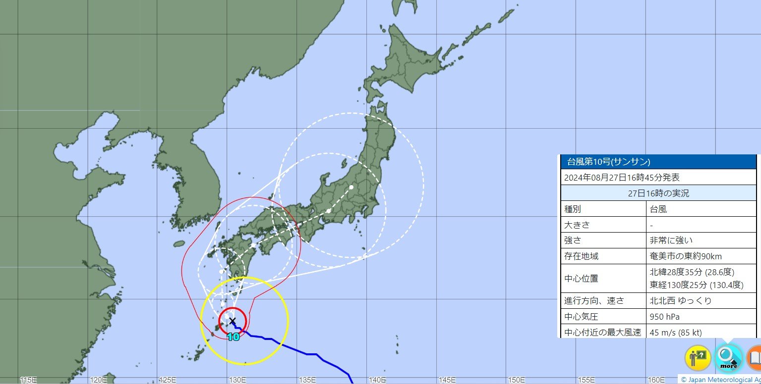 最大瞬間風速は40メートルが予想されます。予報円の中心から半径310キロ以内では風速25メートル以上の暴風域に入るおそれがあります。