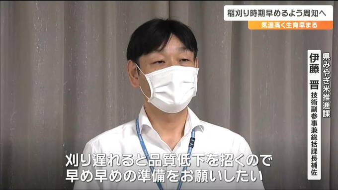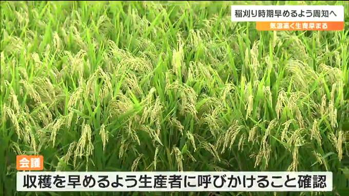 宮城県では本格的な稲刈りはこれからですが、今年のコメの収穫時期などについて県や農協が27日、情報を共有しました。この中では出穂後も気温が高く推移し生育が早まっているとして、稲刈りの時期を早めるよう周知していくことを確認しました。