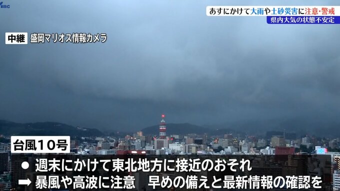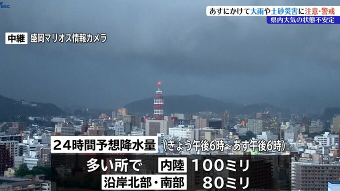 岩手県内は前線などの影響で大気の状態が不安定になっていて、盛岡市には現在、大雨警報、洪水警報が発表されています。