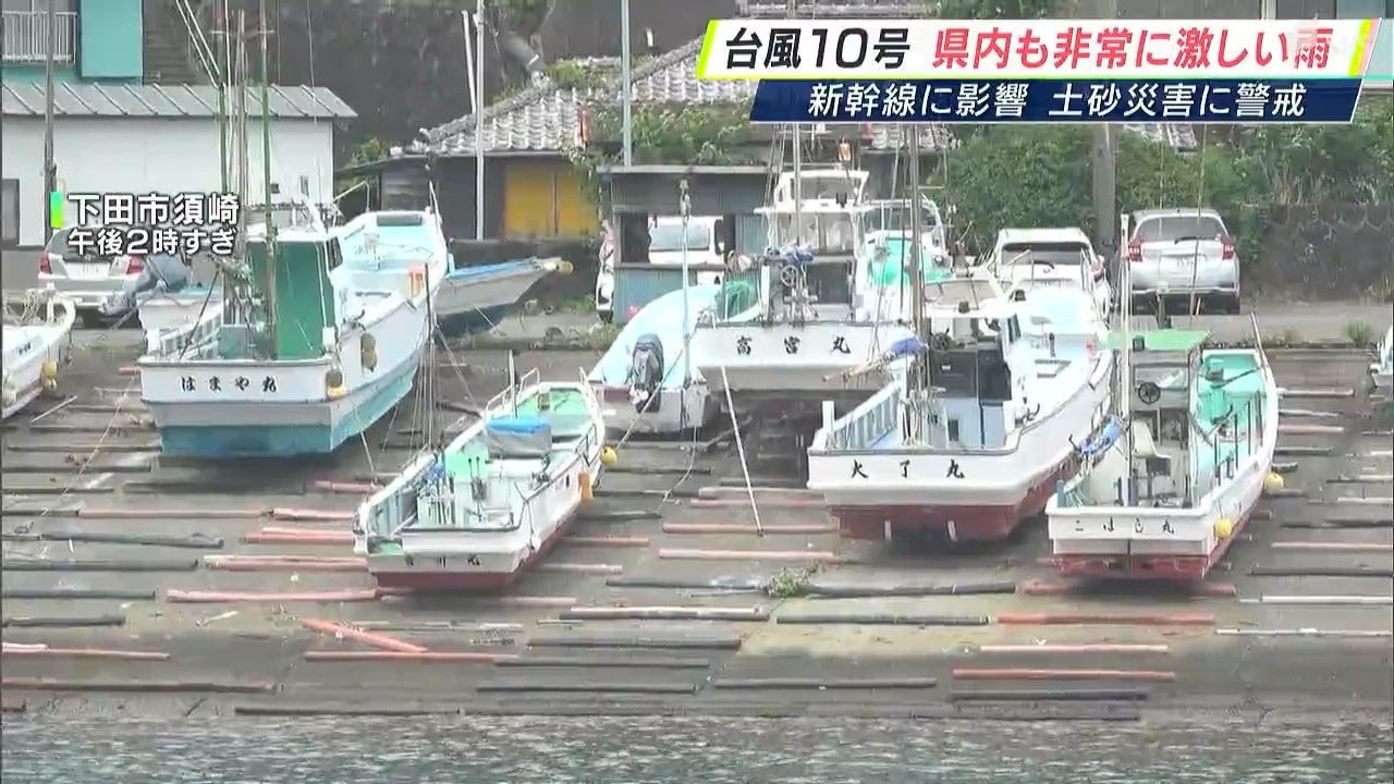 台風10号の接近で、沿岸部では波の高い状態が続いています。下田市の須崎漁港では、多くの漁船が陸揚げされた一方で、29日まで漁を続ける船もあります。