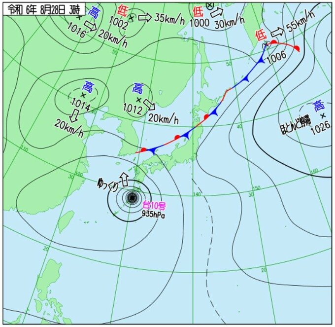 気象庁によりますと前線が日本海から北日本を通り千島近海にのびており、28日は停滞する見込みです。前線に向かって、暖かく湿った空気が流れ込むため、北陸地方では28日夜のはじめ頃にかけて大気の状態が非常に不安定となり、雷を伴って激しい雨が降り、大雨となる所があるでしょう。