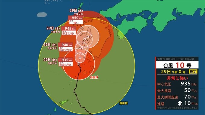 非常に強い台風第10号は、28日22時には屋久島の北西約50キロにあって、1時間におよそ10キロの速さで北へ進んでいます。中心の気圧は935ヘクトパスカル、中心付近の最大風速は50メートル、最大瞬間風速は70メートルで、中心から半径110キロ以内では風速25メートル以上の暴風となっています。