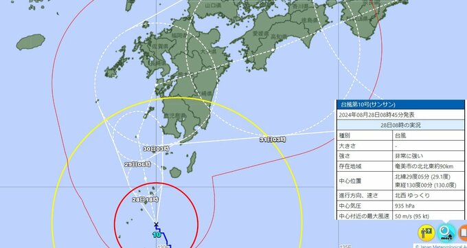 気象庁によりますと非常に強い台風10号は奄美地方付近にあって29日(木)にかけて10km/h未満の遅い速度でやや発達しながら九州付近を北上し、その後九州に上陸するおそれがあります。