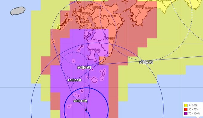 台風本体や台風周辺の雨雲の影響で西日本から東日本にかけての太平洋側を中心に、台風接近前から雷を伴った大雨となる見込みです。台風の動きが遅いため総雨量が多くなり、特に九州南部・奄美地方では、29日にかけて線状降水帯が発生して大雨災害発生の危険度が急激に高まる可能性があります。また、前線の影響で、東北地方を中心に29日にかけて雷を伴った大雨となる見込みです。