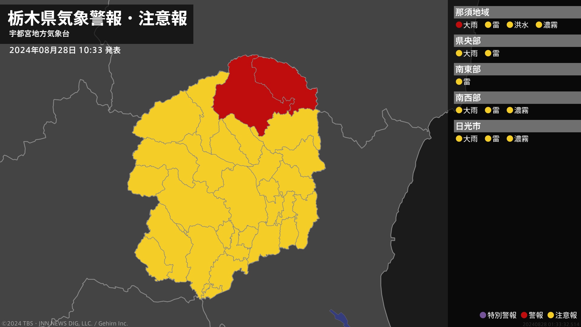 気象台は、午前10時33分に、大雨警報(浸水害)を那須町に発表しました。