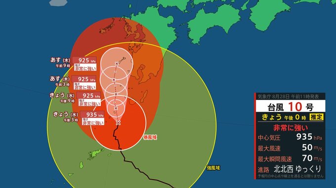 気象庁によりますと非常に強い台風10号は、28日午前10時には屋久島の南南西約120キロにあって、ゆっくりした速さで北北西へ進んでいます。中心の気圧は935ヘクトパスカル、中心付近の最大風速は50メートル、最大瞬間風速は70メートルで、中心から半径110キロ以内では風速25メートル以上の暴風となっています。