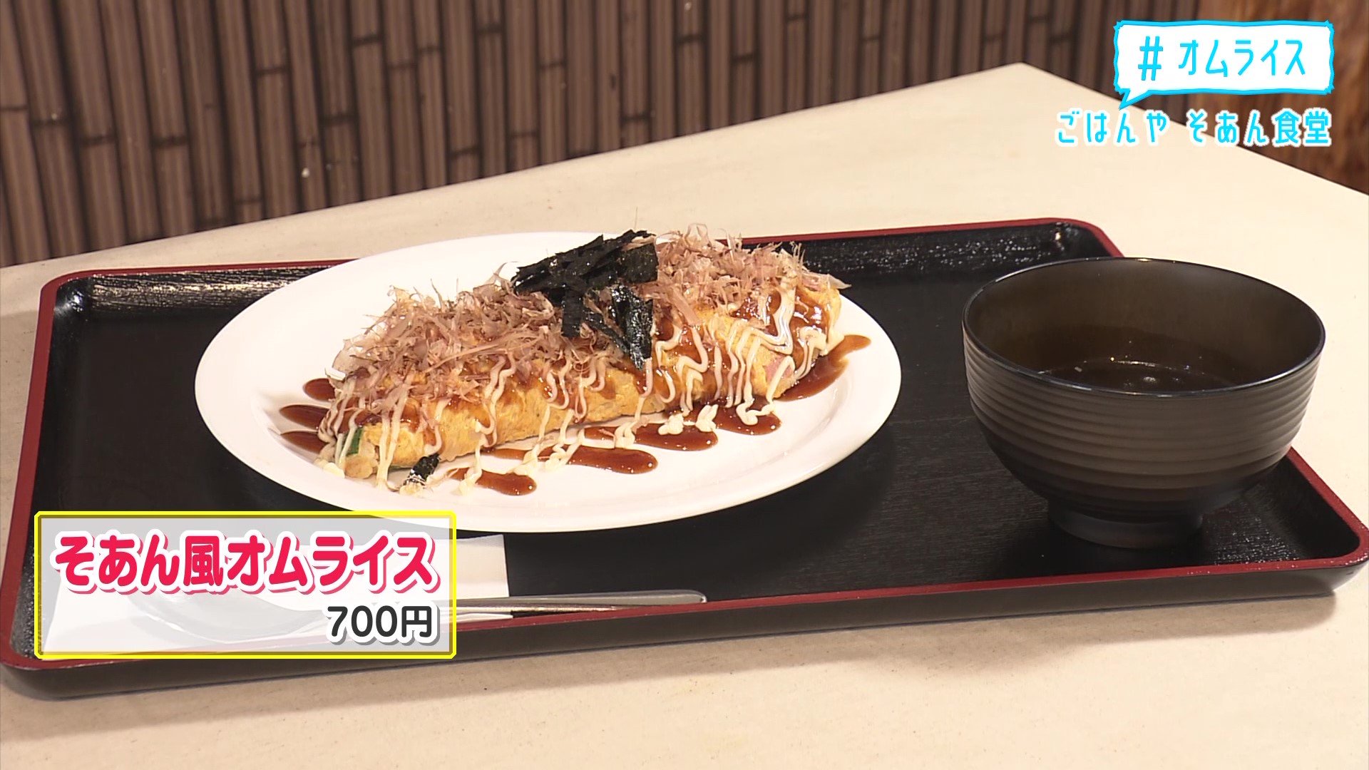 【そあん風オムライス(700円)】は、のりに鰹節、そしてお好み焼きソースと、一見して『とん平焼き』や『お好み焼き』にも見えるオムライスです。