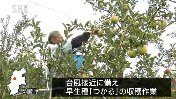 非常に強い台風10号の接近を前に、安曇野市のリンゴ畑では28日、農家が収穫作業に追われていました。