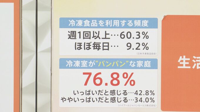 まず冷凍食品を利用する頻度は、週に1回以上という方も60.3パーセントいます。ほぼ毎日という方も9.2パーセントいるんです。その結果、冷凍庫が“パンパン”になりがちということで、冷凍庫が“パンパン”な方は、76.8パーセントと約8割のご家庭でたくさん冷凍庫に入れて使っていることがわかりました。その影響で生活にも変化が出ているそうです。