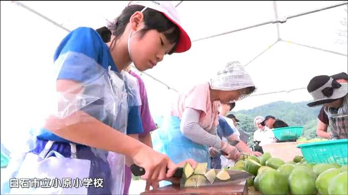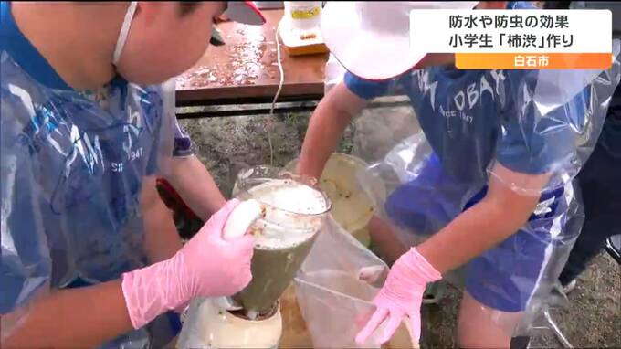 宮城県白石市の小学生が、まだ青い状態の熟していないカキの実を使い「柿渋」作りに挑戦しました。
