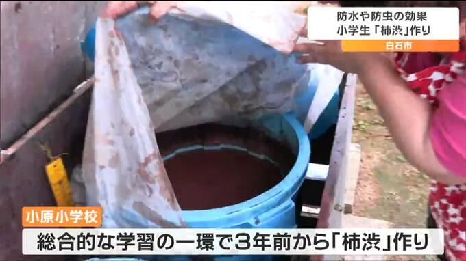 小原小学校では総合的な学習の一環で3年前から柿渋作りを企画しています。28日作ったおよそ30リットル分の柿渋は、日陰の涼しい場所で保管し、毎日1回かき混ぜながら3年ほど熟成させます。完成した柿渋は地元のイベントなどで販売するということです。