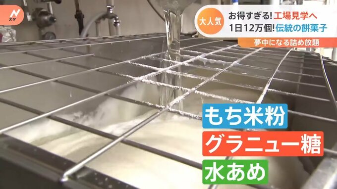 まずはどんな材料が使われているのか、国産のもち米粉、そしてさらにはグラニュー糖、大胆に使っていく!さらには"水あめ"だ。まさに雨が降るように水あめを使った。甘く日持ちのするお餅に仕上がるように研究された特別配合だそう!