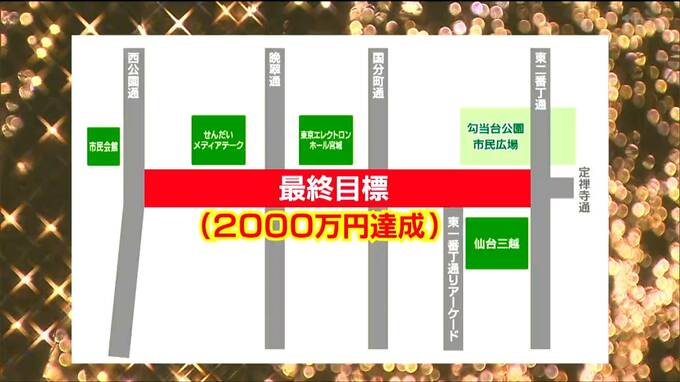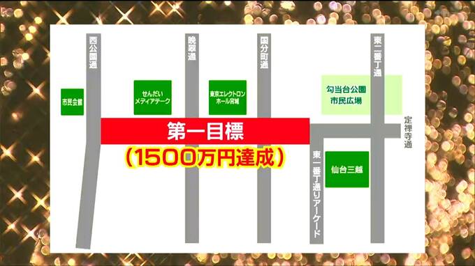 現段階の点灯区間は仙台市民会館から国分町通までの予定ですが、クラウドファンディングで第一目標の1500万円を達成すると、仙台市民会館から東一番丁通アーケードまで、最終目標の2000万円を達成すると、東二番丁通まで点灯区間を延長できるということです。
