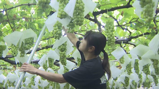 台風の接近に備えて山梨県甲州市の観光農園はブドウ棚を補強する対策を行っていますが、台風の速度が遅く発送作業に影響が出ています。専果園 五味小百合社長:「これでブドウ棚を支えて、(風で)揺れないように…