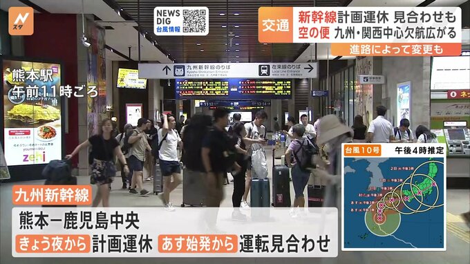 台風10号の接近に伴う交通への影響について、最新情報です。JR各社によりますと、九州新幹線は熊本-鹿児島中央駅間で、きょう夜から計画運休が決まっているほか、あすも始発から運転を見合わせるということです。…