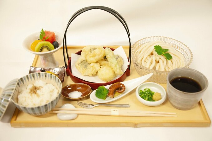 藤井七冠が選んだのは、兵庫県産の小麦「ふくほのか」を使用した「鱧と夏野菜の天婦羅うどん」。
