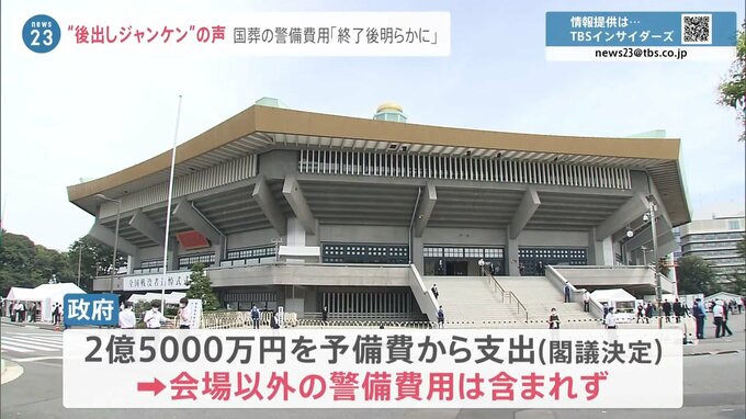 これまで政府は国葬について、2億5000万円を予備費から支出することを閣議決定していますが、この金額には会場以外の警備費用が含まれていません。