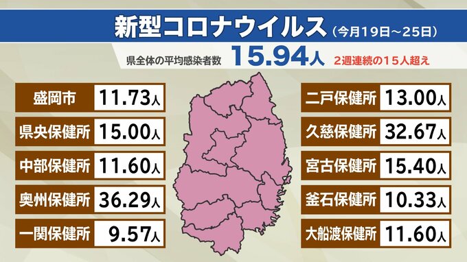 8月19日から25日までの岩手県内の1定点医療機関あたりの新型コロナウイルスの感染者数は15.94人と前の週を上回り、2週連続で15人を超えました。新型コロナウイルスの感染者数を保健所別にみると、奥州が36.29人、…