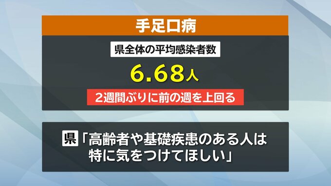 一方、子どもを中心に感染が広がる手足口病の平均も6.68人と2週ぶりに増加に転じました。