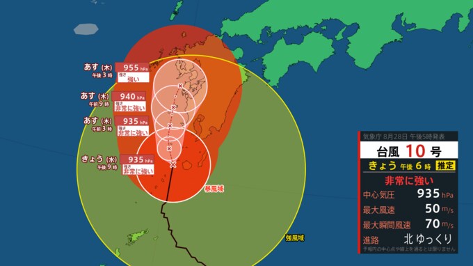 台風10号・いまだ午後5時からほぼ位置変わらず… 現在「屋久島の西南西約40km」中心気圧は935hPa「非常に強い勢力」で北にゆっくり北上中 いまどこ?これからどこへ?【台風情報・最新進路予想図・気象庁データ(28日午後8時更新)】 青森テレビ 2024年8月28日(水) 20:02 国内