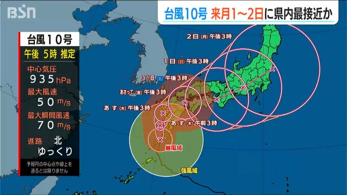非常に強い台風10号(サンサン)は、9月1日から2日頃にかけて新潟県内に最も接近しそうです。