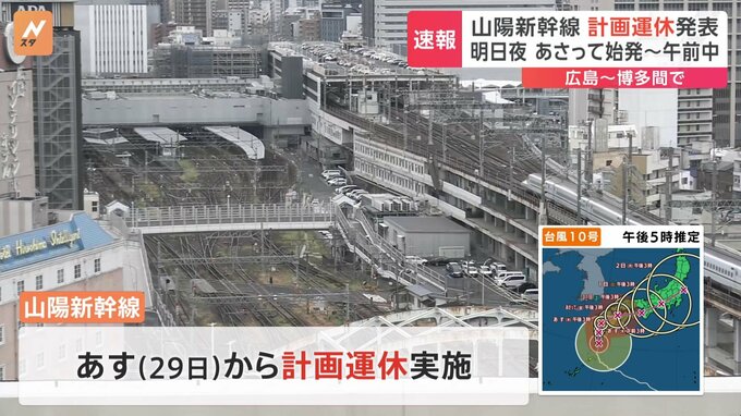JR西日本は山陽新幹線について、広島、博多間での29日夜と、30日朝から午前中にかけての計画運休を発表しました。台風10号の接近に伴い、JR西日本は山陽新幹線について、29日から計画運休を実施すると発表しました…