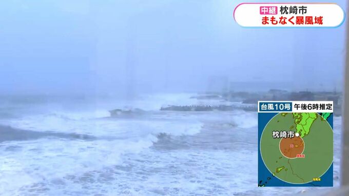 ここからは台風が接近しつつある県本土から中継を結んでお伝えします。はじめに、まもなく暴風域に入る枕崎市からです。暴風波浪特別警報が発表されている枕崎市です。午後からは市街地でも雨風が強まってきました…