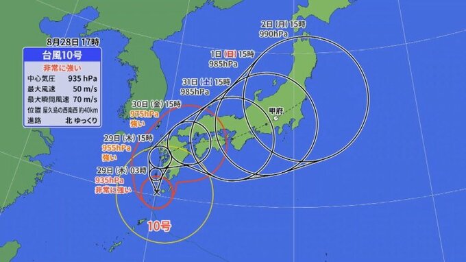 非常に強い台風10号は鹿児島県の屋久島の南西の海上約50kmにあり、あす29日にかけて九州に接近、上陸しその後、来月2日にかけて列島を縦横断する見通しです。