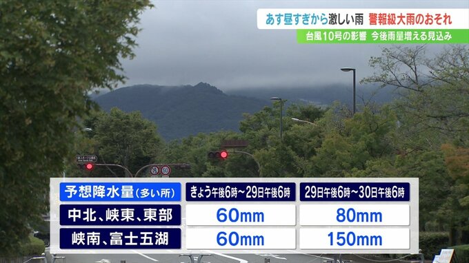 非常に強い台風10号の影響で山梨県内はあす29日昼過ぎから雷を伴った激しい雨が降り警報級の大雨になるおそれがあります。