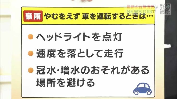 【台風接近中】運転中に大雨で立ち往生したら...「車の鍵を置いてから逃げて」その理由は?【命を守る行動】 RSK山陽放送 2024年8月28日(水) 18:19 国内 それでも「運転しなければならない」時は。。。 やむを得ない事情で外出する際は、 ①ヘッドライトを点灯し ②速度を落として走行する ③冠水・増水の恐れがある場所を避ける。 この3点を守って運転するようにしてください。